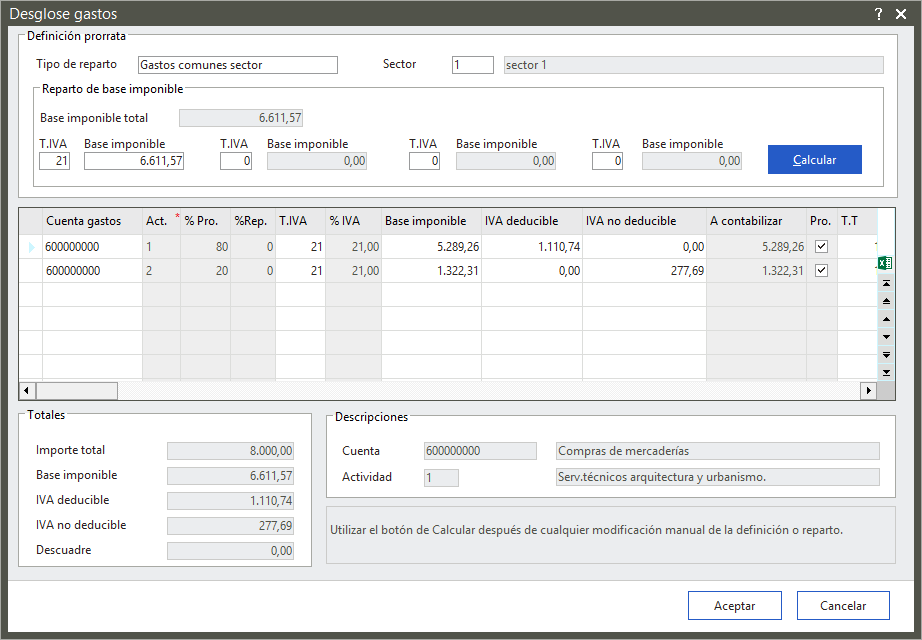 Para aplicar este reparto pulsamos el botón CALCULAR y Sage calculará automáticamente la Base Imponible, Cuota de IVA, identificando como Cuota IVA Deducible o No Deducible según configuración de Actividades del Sector informado.