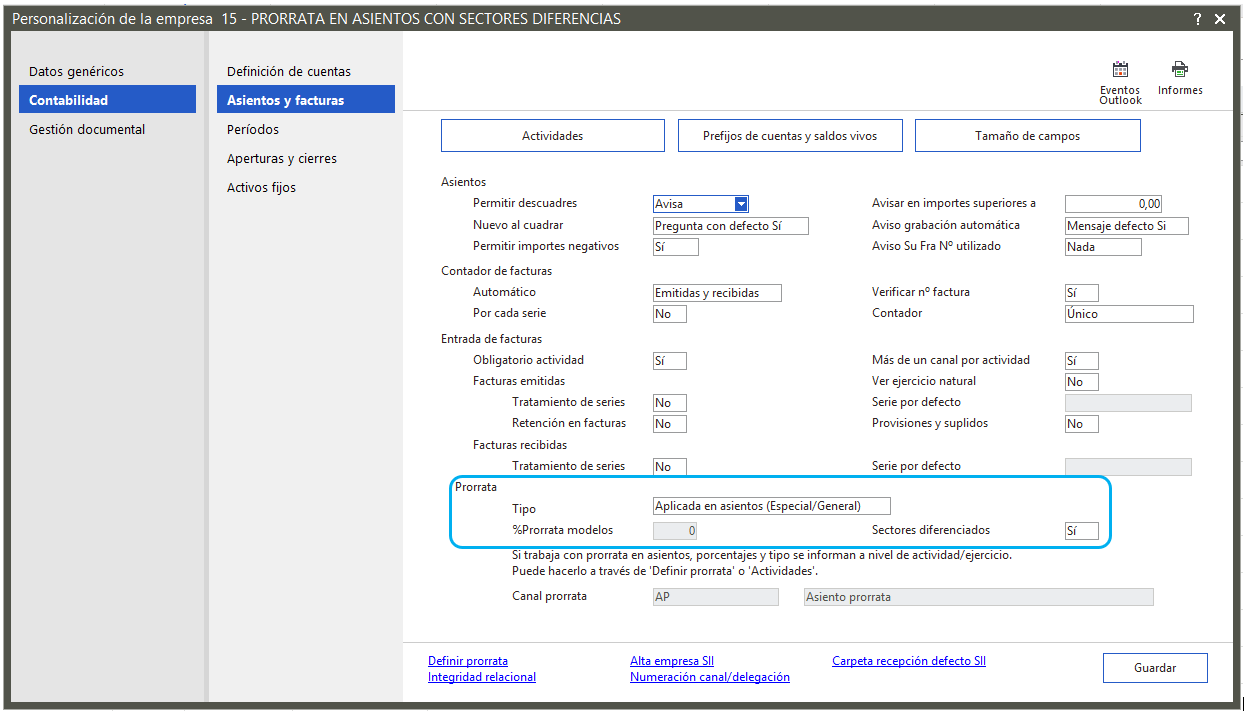 Si nuestra empresa trabaja con Prorrata con Sectores Diferenciados debemos realizar la siguiente configuración previa a la generación de asientos contables: