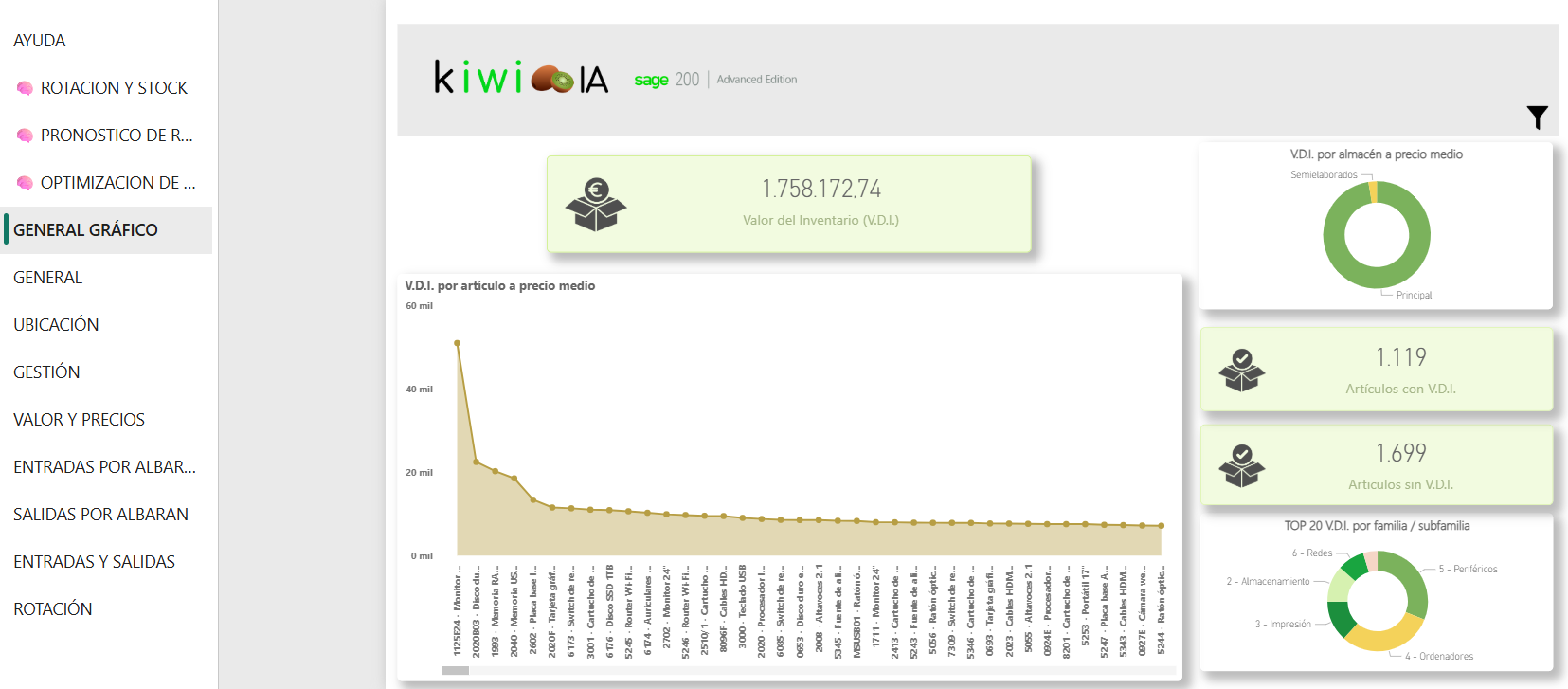 Dentro del informe de Almacén, esta pestaña obtiene la información de los acumulados de stock de Sage y permite conocer el VDI (Valor de Inventario) desde distintos prismas. Todo ello en un formato muy visual que le ayudará a detectar anomalías y a poner en marcha mecanismos para su corrección.