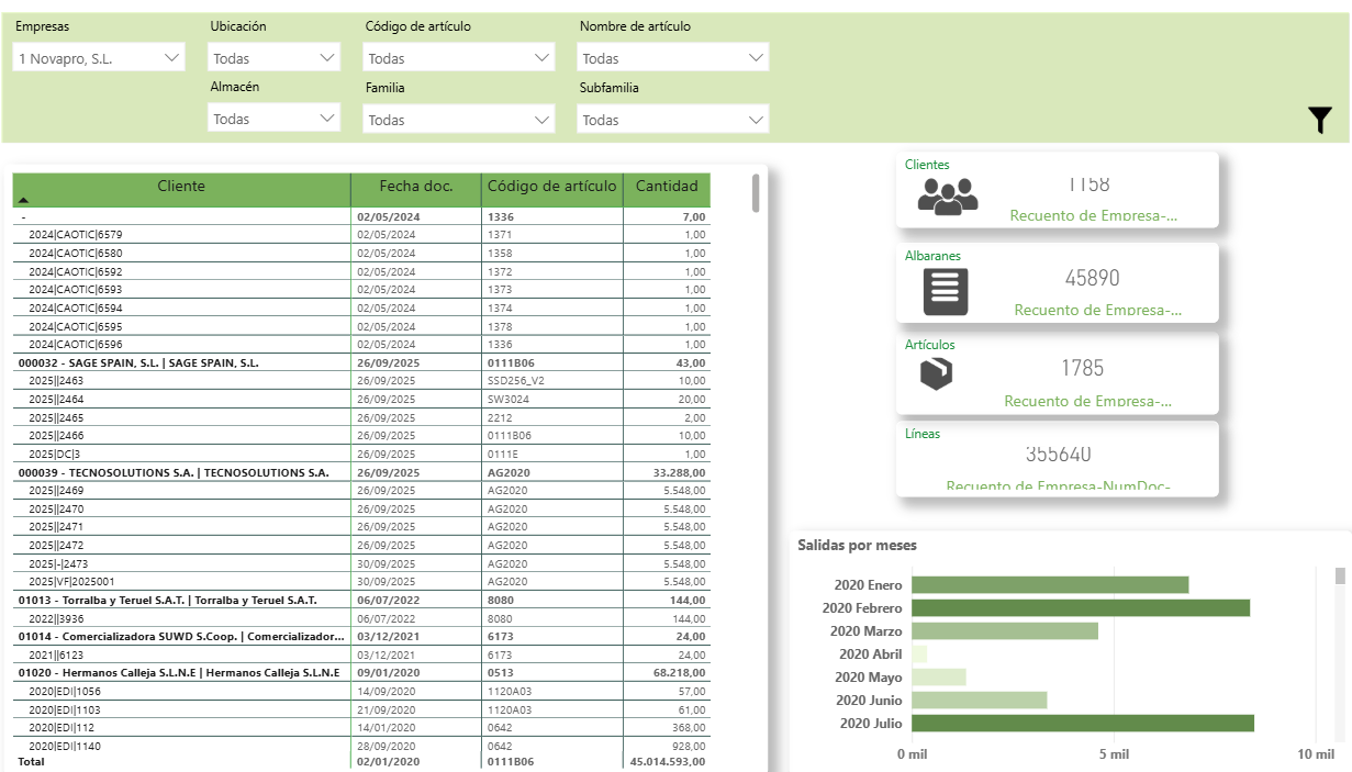 Podrás obtener el detalle por cliente y profundizar a albarán y artículo. En el siguiente artículo explicamos como utilizar la función de Resumir o Drill Down en Power BI