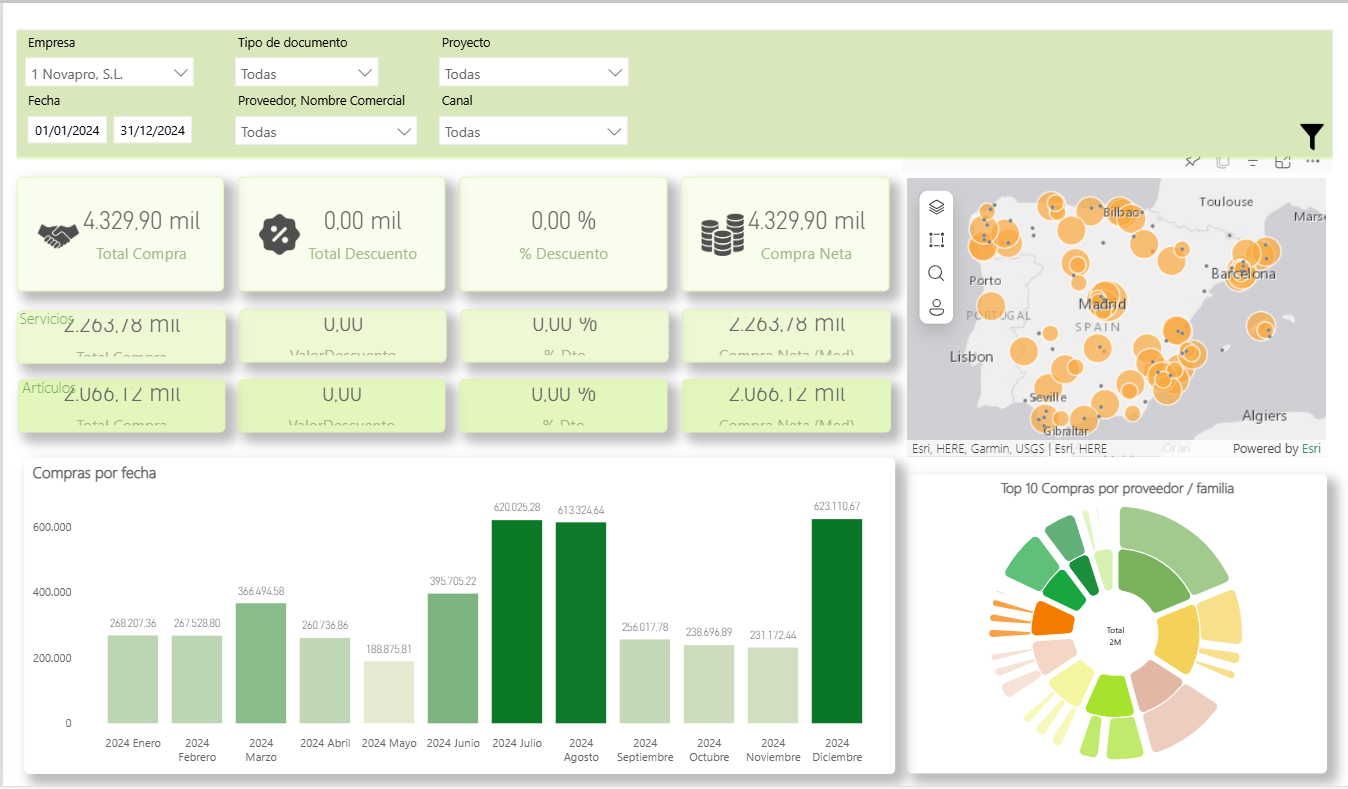 Mapa proveedores: Nos muestra en el mapa las compras netas por proveedor en la ciudad/país. De esta manera, podremos localizar y analizar las compras por su ubicación.