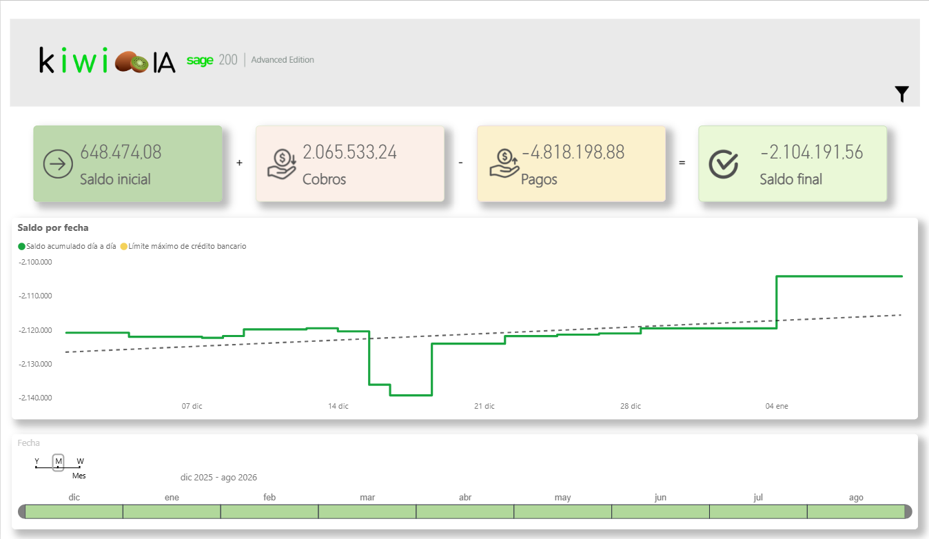 💡 Nota: Saldo inicial : corresponde al saldo en la fecha de la sincronización en las cuentas 57* y 5201* Saldo a fecha: corresponde la previsión de saldos por banco en función de las fechas de vencimiento en la posición tesorera. Este dato se muestra encolumnado con importes a 30, 60, 90, 120, 180 días y >180 días; obteniendo al final y saldo acumulado. |