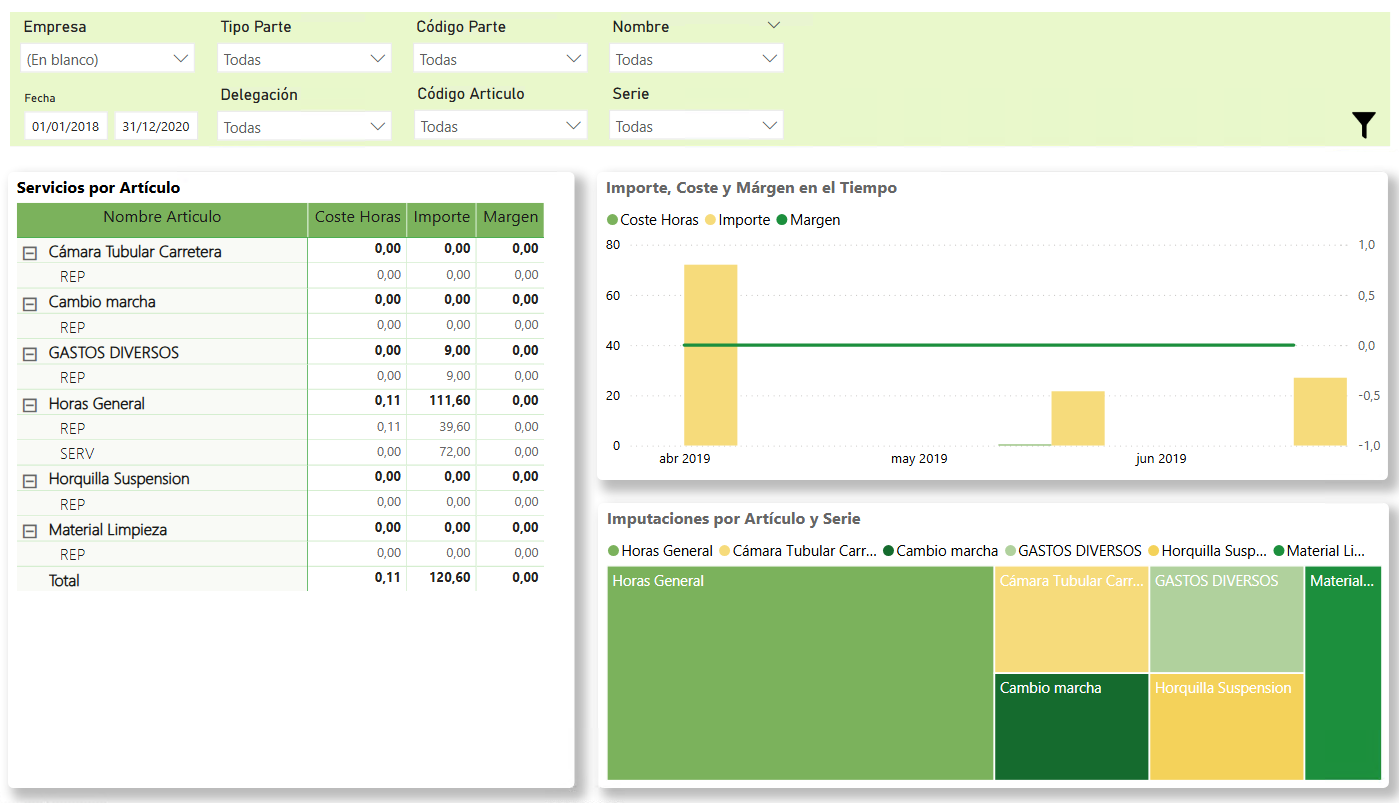 Esta pestaña dentro del informe de PostVenta se centra en el análisis de servicios, obteniendo el detalle del rendimiento de cada artículo.