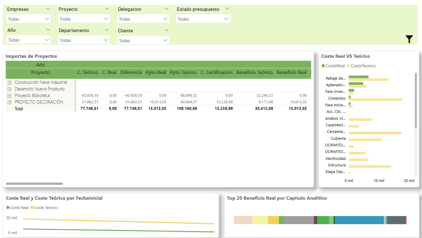 Proporciona indicadores como coste teórico, real, diferencia, presupuesto real, teórico, beneficio teórico y real, entre otros.