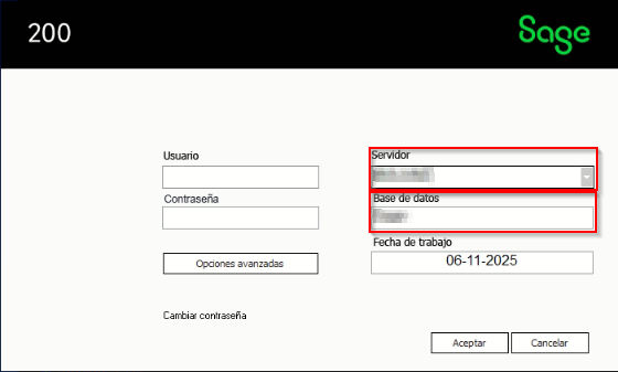 Abrir el cliente de Sage, para verificar que el nombre del servidor y de la base de datos sea el correcto. Esto lo pueden comprobar haciendo clic en "Opciones avanzadas":