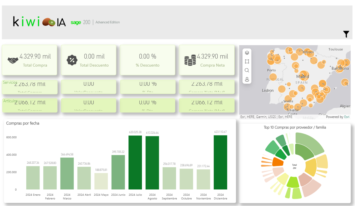 El informe de Compras ubicado en el área de trabajo de KIWI Compras permitirá al usuario analizar diferentes aspectos de sus compras.