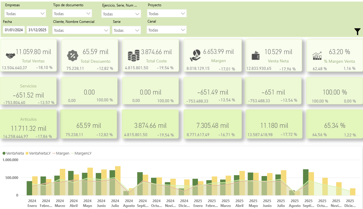 En este informe podremos analizar nuestras ventas poniendo el foco en la comparativa respecto al ejercicio anterior, permitiéndonos ver la evolución y las desviaciones mediante tarjetas de KPI y gráficas comparativas.