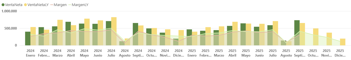 Automáticamente, el sistema realizará la comparativa de cada uno de esos meses con el respectivo mes de su año pasado (LY), facilitando el análisis de estacionalidad y tendencias interanuales.