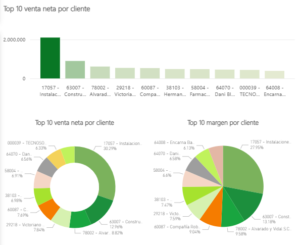 - Top 10 venta neta por cliente (Gráfico de Donut): Representa la cuota de mercado o "tarta" que ocupa cada uno de los 10 mejores clientes sobre el total de ese Top 10.