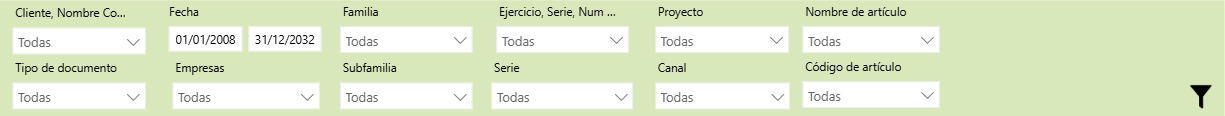 El informe permite múltiples filtros en la parte superior (Empresas, Familia, Proyecto, Canal, etc.) que te ayudarán a focalizarte en la información que necesitas analizar.