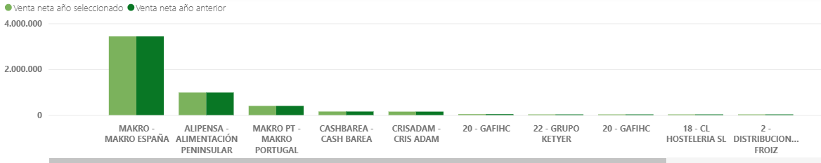 Venta neta año seleccionado vs Venta neta año anterior: Esta gráfica compara visualmente el volumen de ventas por Cadena.