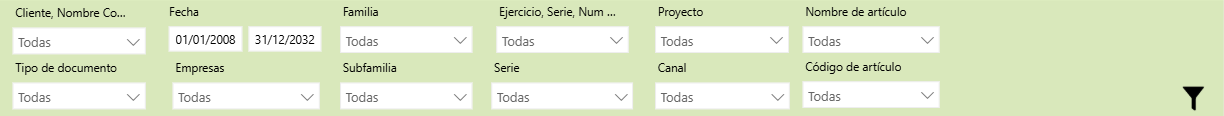 El informe mantiene los filtros superiores (Fecha, Familia, Proyecto, etc.) para focalizar el análisis.