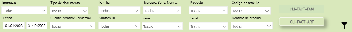 El informe permite múltiples filtros en la parte superior (Fecha, Tipo de documento, Familia, Proyecto, Código de artículo, etc.) que te ayudarán a focalizarte en la información que necesitas analizar.