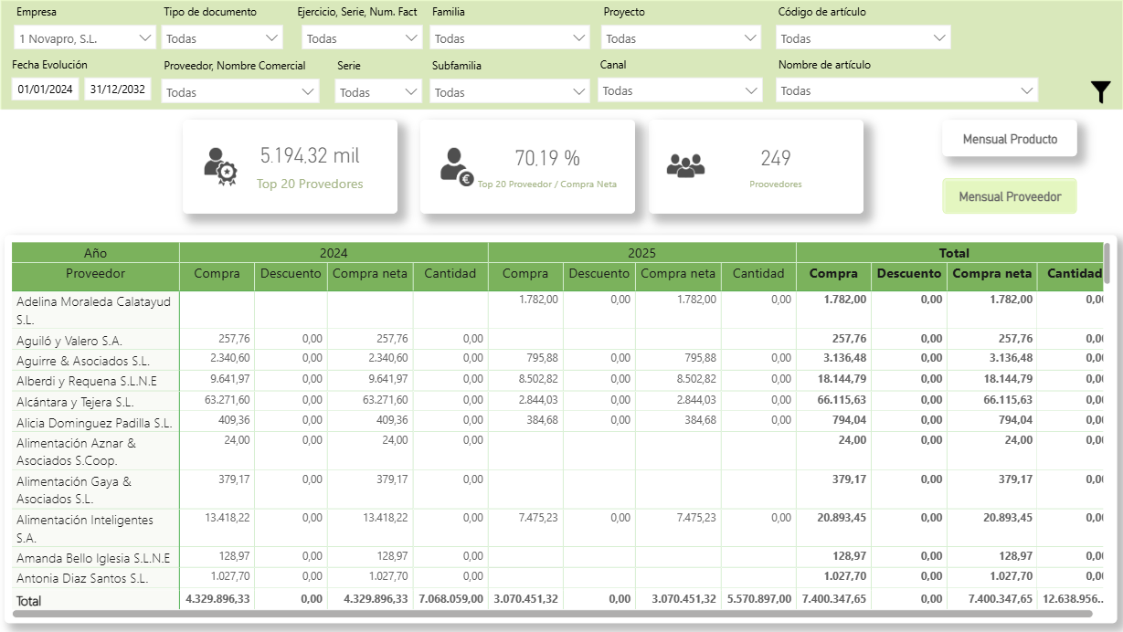 En este informe podremos analizar nuestras compras centrándonos en el Proveedor, con un enfoque en la evolución de las compras año a año. El informe permite seleccionar el detalle Mensual Proveedor (como se ve en la imagen) o Mensual Producto.