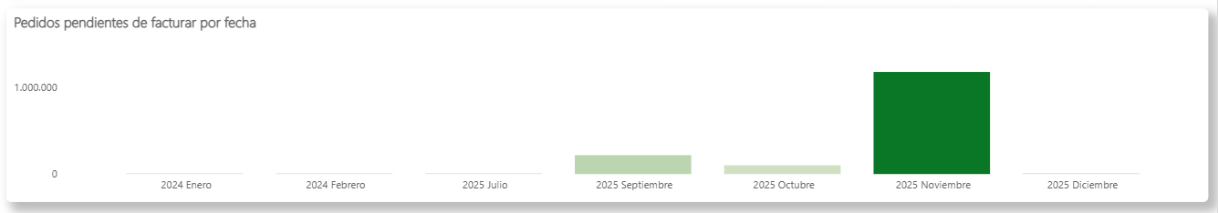 En la parte inferior del informe, se muestra un gráfico de barras que visualiza la evolución de los pedidos pendientes de facturar por fecha.