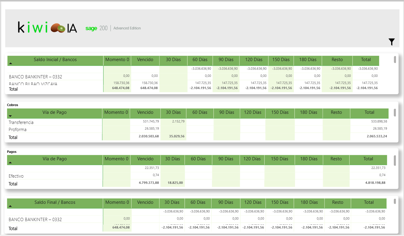 - Pagos: Muestra las previsiones de pago (según la posición tesorera) segmentadas por Vía de Pago (ej. Efectivo).