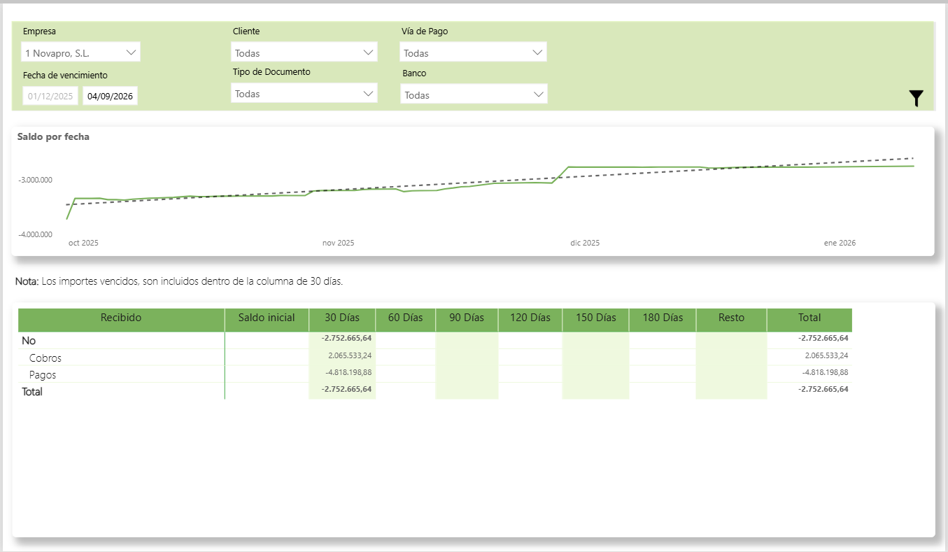 El informe permite múltiples filtros que te ayudarán a focalizarte en la información que necesitas analizar, incluyendo Empresa, Cliente, Vía de Pago, Fecha de vencimiento, Tipo de Documento y Banco.