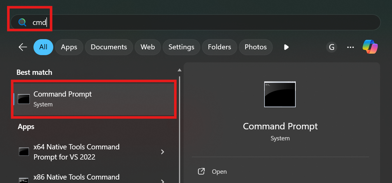Acceder a la consola de comandos: Haga clic en el bot贸n de Inicio, escriba CMD en el buscador y abra la aplicaci贸n "S铆mbolo del sistema" (Command Prompt).
