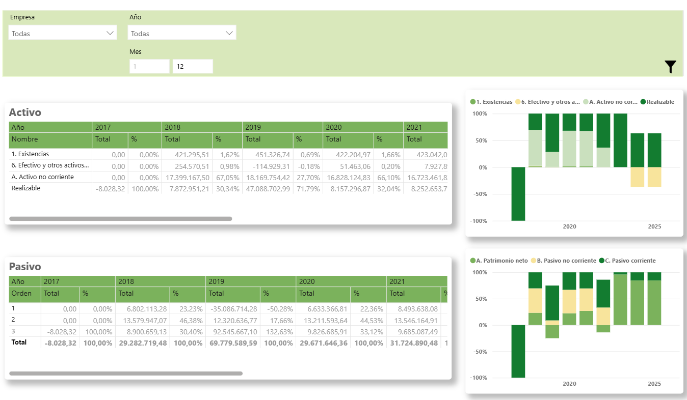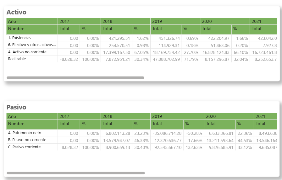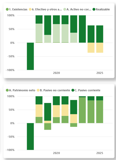 Activo: Muestra el total y el porcentaje de cada masa patrimonial en los años disponibles. Mediante el drill down obtendrás el desglose por componentes individuales (Existencias, Efectivo y otros activos, Activo no corriente y Realizable).
