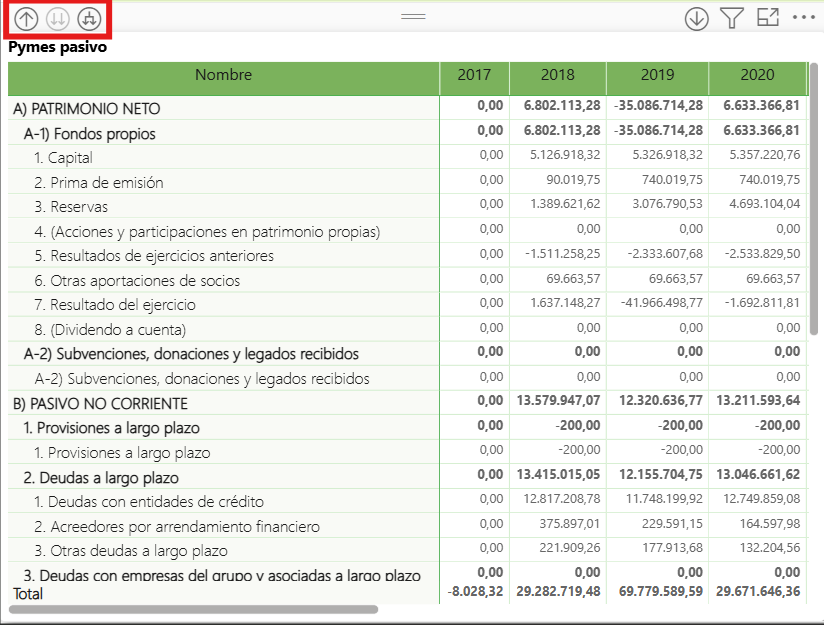 Podrás obtener el detalle de cada una de las masas patrimoniales tanto en la sección de Activo como en la de Pasivo. En el siguiente artículo explicamos como utilizar la función de Resumir o Drill Down en Power BI.