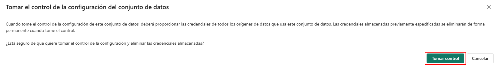 Para tomar el control y poder modificar la configuración del modelo semántico, tendremos que clicar en el botón verde que pone "Tomar control".