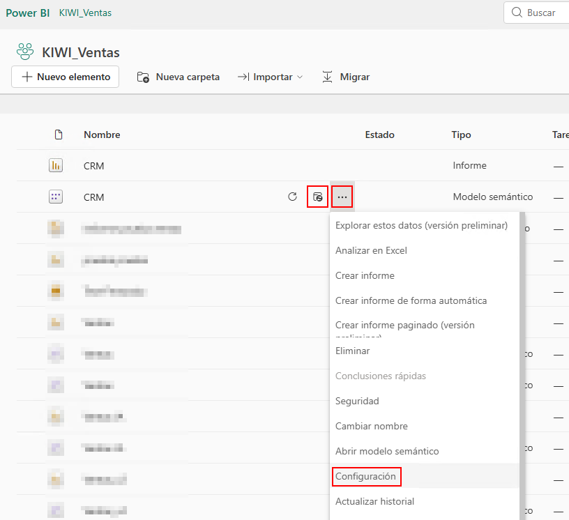 Para este ejemplo, como vemos en la siguiente captura, utilizaremos el modelo semántico de CRM, en el área KIWI_Ventas. Tendremos que ir a la configuración del modelo semántico, para ello, desde la línea en la que la columna "Tipo" nos indica "Modelo Semántico", tenemos dos opciones. La primera es clicar en "Programar actualización" que es el icono con forma de ventana con un icono de refrescar. La segunda es clicar en los 3 puntos y seleccionar "Configuración" en el menú desplegable que nos aparece.