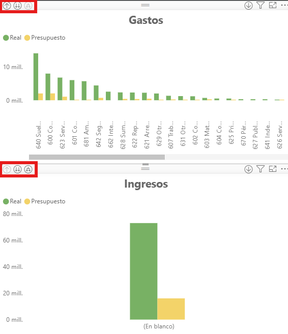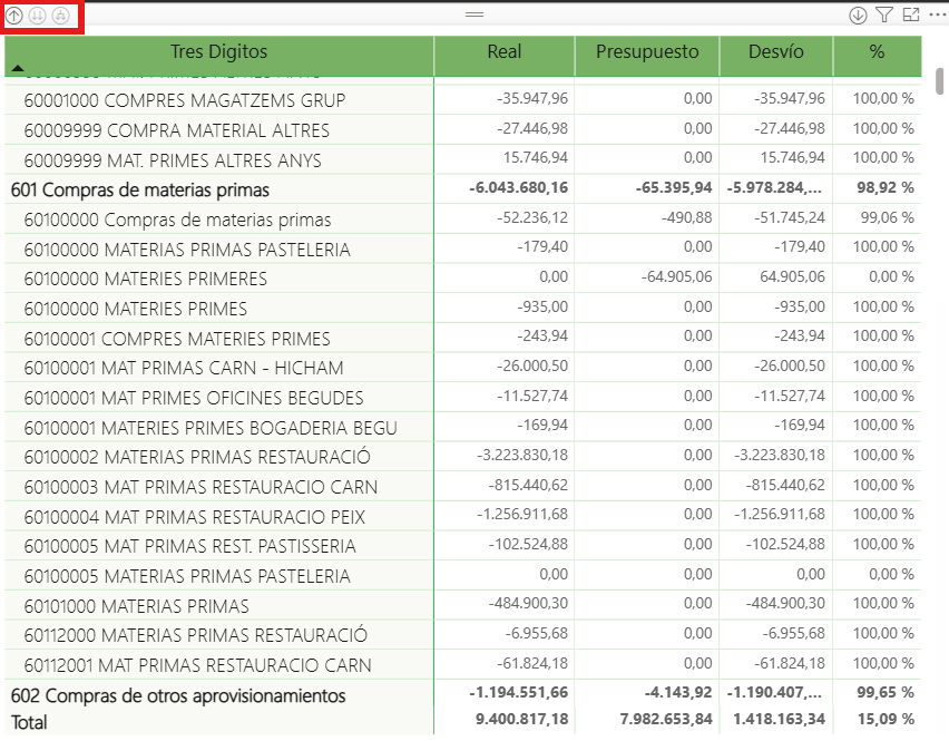 Podrás obtener el detalle de cada una de las cuentas navegando entre los distintos niveles de agrupación. En el siguiente artículo explicamos cómo utilizar la función de Resumir o Drill Down en Power BI.