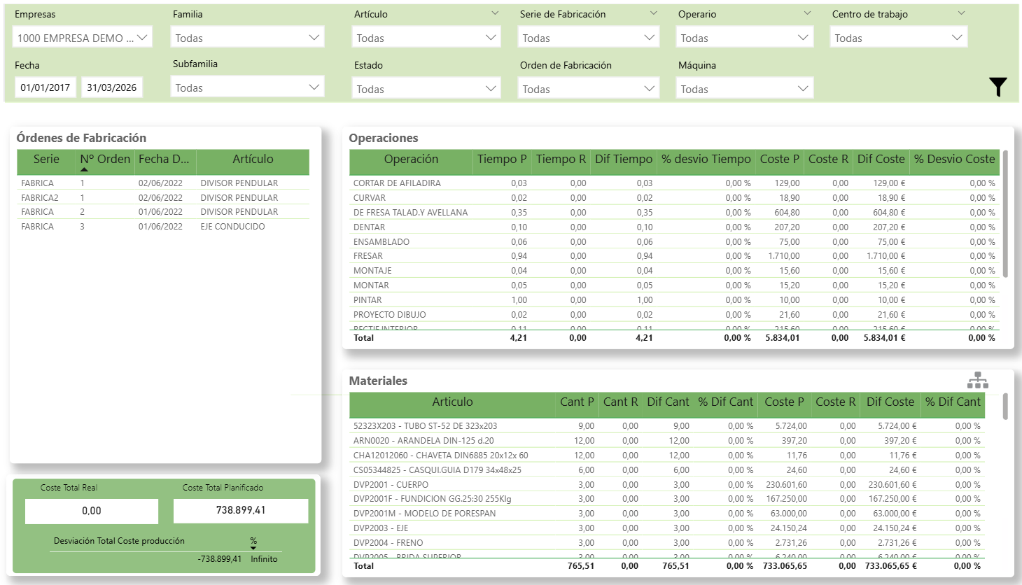 Resumen de costes: Muestra el coste total real, el coste total planificado y la desviación total del coste de producción con su porcentaje.