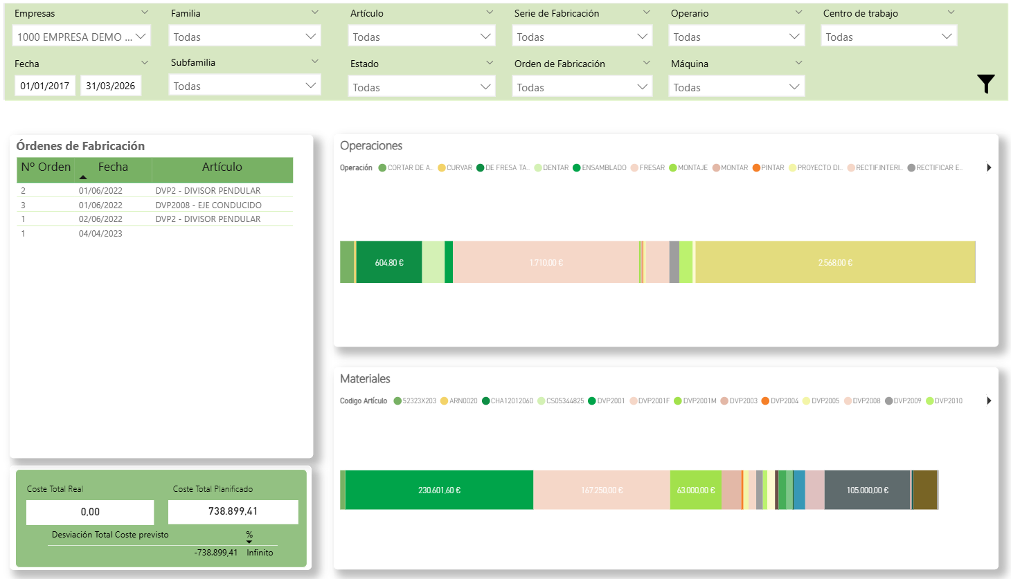 El informe te permite filtrar por Empresa, Familia, Artículo, Serie de Fabricación, Operario, Centro de Trabajo, Fecha, Subfamilia, Estado, Orden de Fabricación y Máquina para focalizarte en la información que necesitas analizar.