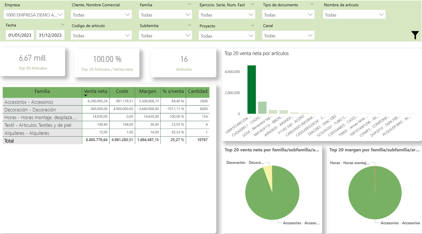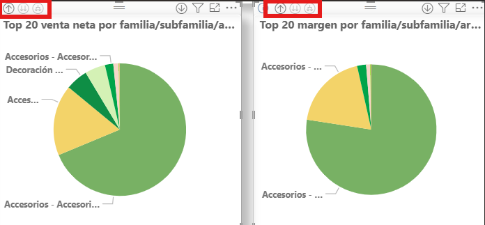 - Top 20 margen por familia/subfamilia/artículo: Muestra la distribución porcentual del margen entre familias y artículos mediante un gráfico circular. Mediante el drill down podrás navegar entre los distintos niveles de agrupación.