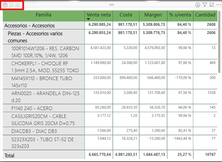 Podrás obtener el detalle de cada familia desglosado por subfamilia y artículo. En el siguiente artículo explicamos cómo utilizar la función de Resumir o Drill Down en Power BI.