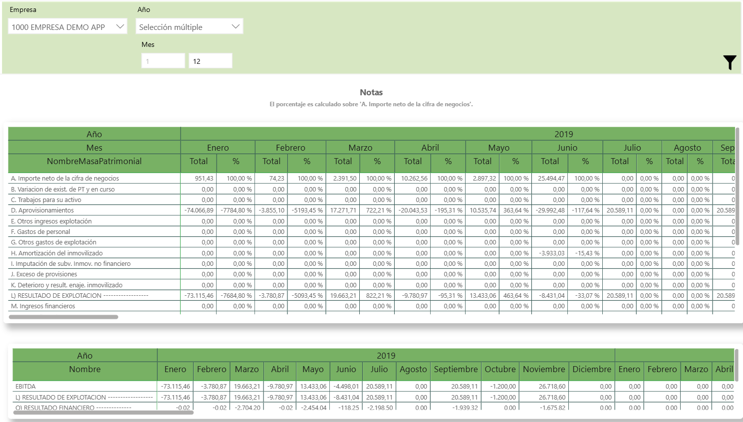 - Cuenta de pérdidas y ganancias: Muestra cada partida (desde A. Importe neto de la cifra de negocios hasta el Resultado del ejercicio) con su importe total y su porcentaje sobre la cifra de negocios. Mediante el drill down podrás navegar entre la vista mensual detallada y la vista comparativa por años.
