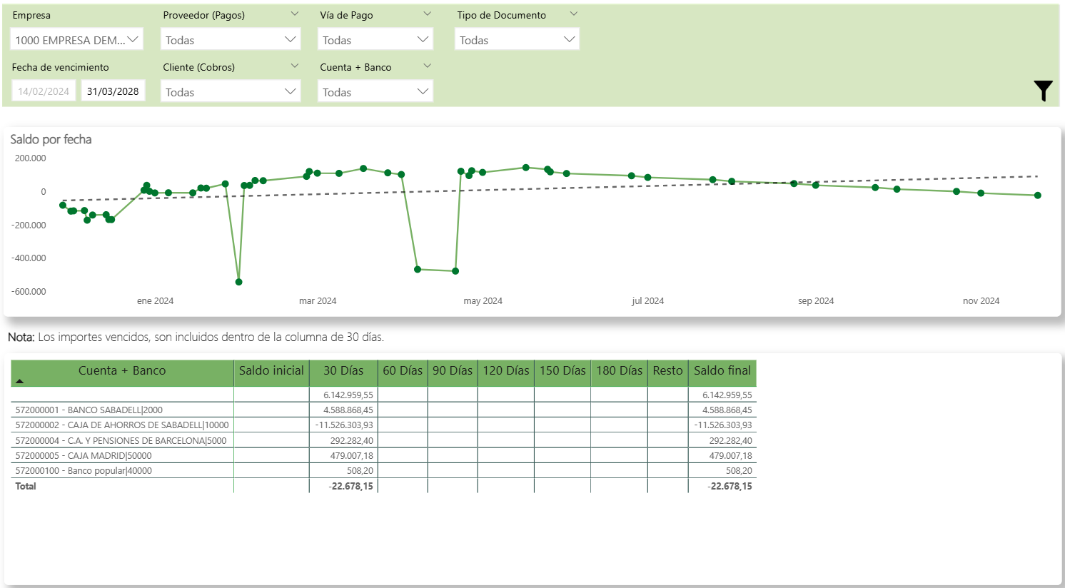 Tabla de tesorería por banco: Muestra cada cuenta bancaria con su saldo inicial, los importes distribuidos por tramos de vencimiento (30, 60, 90, 120, 150 y 180 días y Resto) y el saldo final. Cabe destacar que los importes vencidos son incluidos dentro de la columna de 30 días.