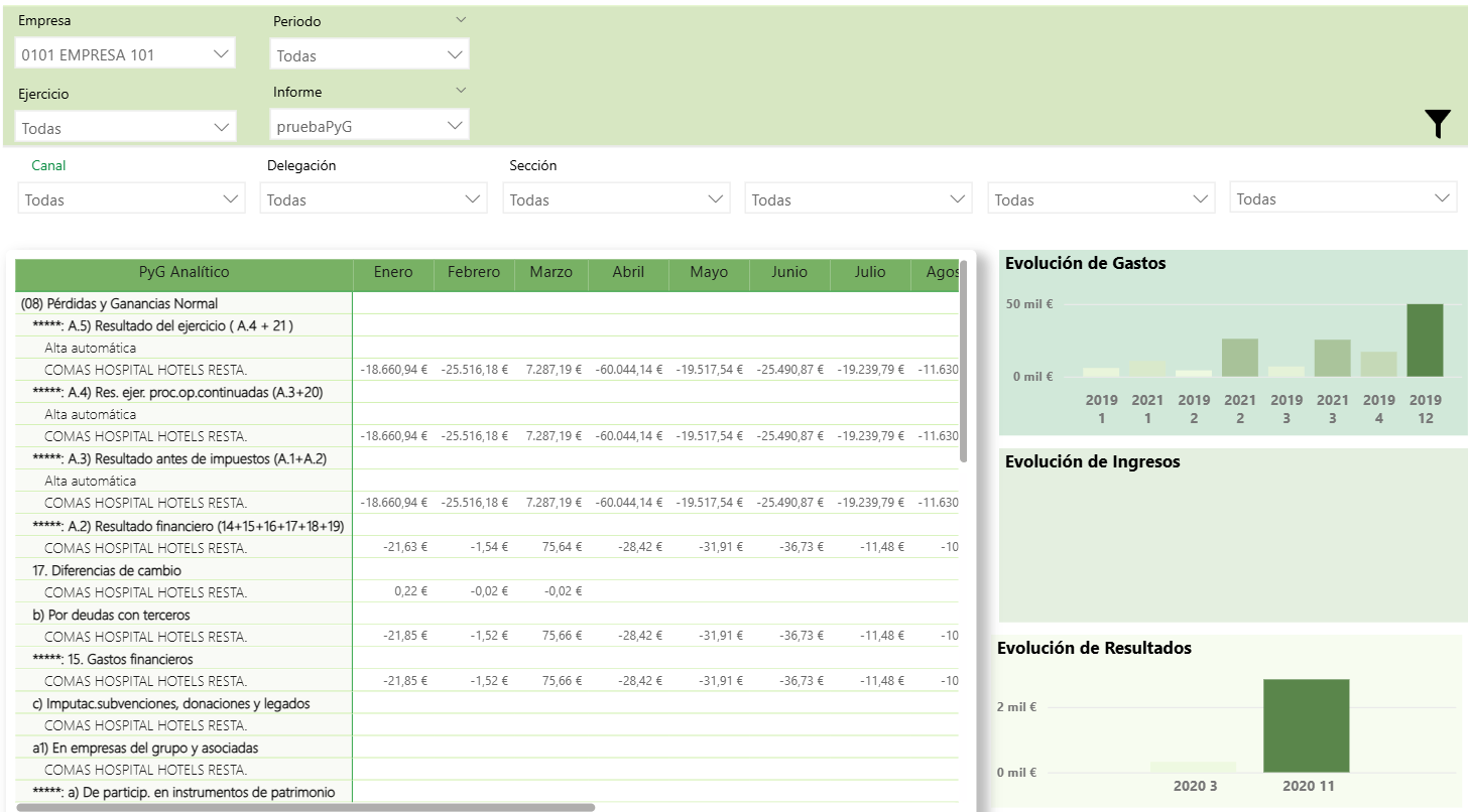 - Evolución de Resultados: Muestra la evolución temporal del resultado mediante un gráfico de barras. Mediante el drill down podrás navegar entre la vista anual y el detalle mensual.