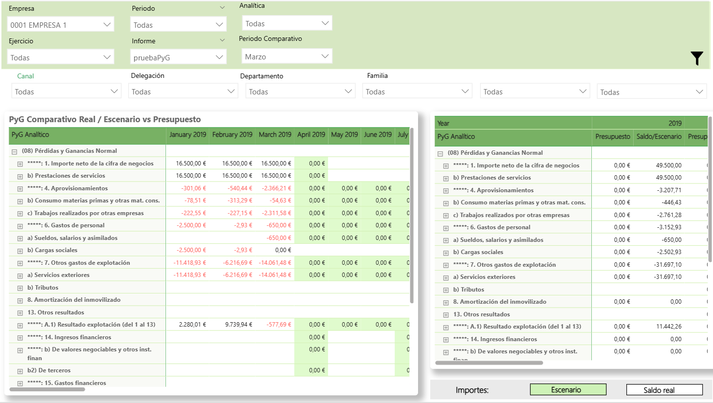 Además, dispones de una leyenda de Importes que te permite alternar la visualización entre los datos de escenario y los datos de saldo real.
